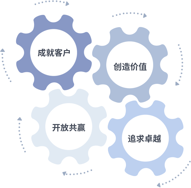 成就客户是一切决策的出发点,,,,创造价值是衡量所有工作的标准,,,追求卓越是我们做事做人的态度,,开放共赢是我们的格局也是最终的结果。。。。价值观的齿轮环环相扣,,,,推动着组织里的每个人不断向前。。